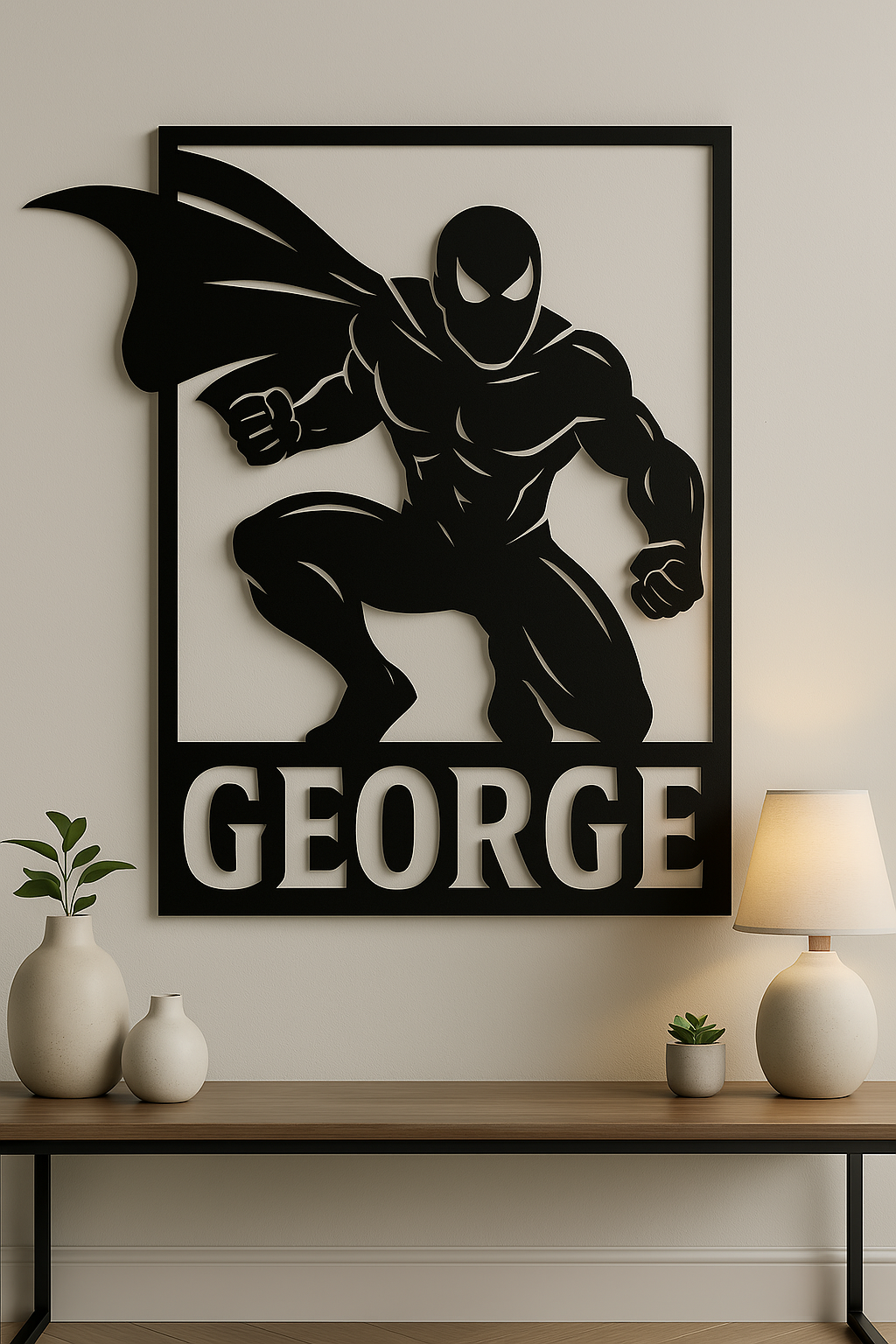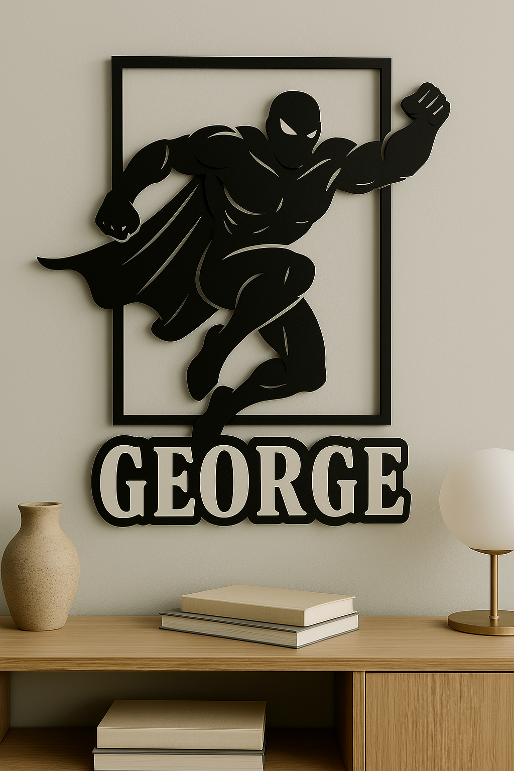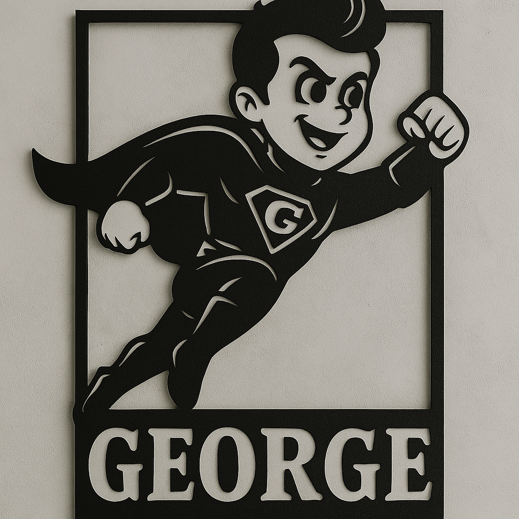 Pe lângă silueta impresionantă, acest decor include numele tău sau al persoanei dorite (în cazul de față „GEORGE”), ceea ce îl transformă într-un cadou unic și memorabil pentru orice fan al supereroilor.