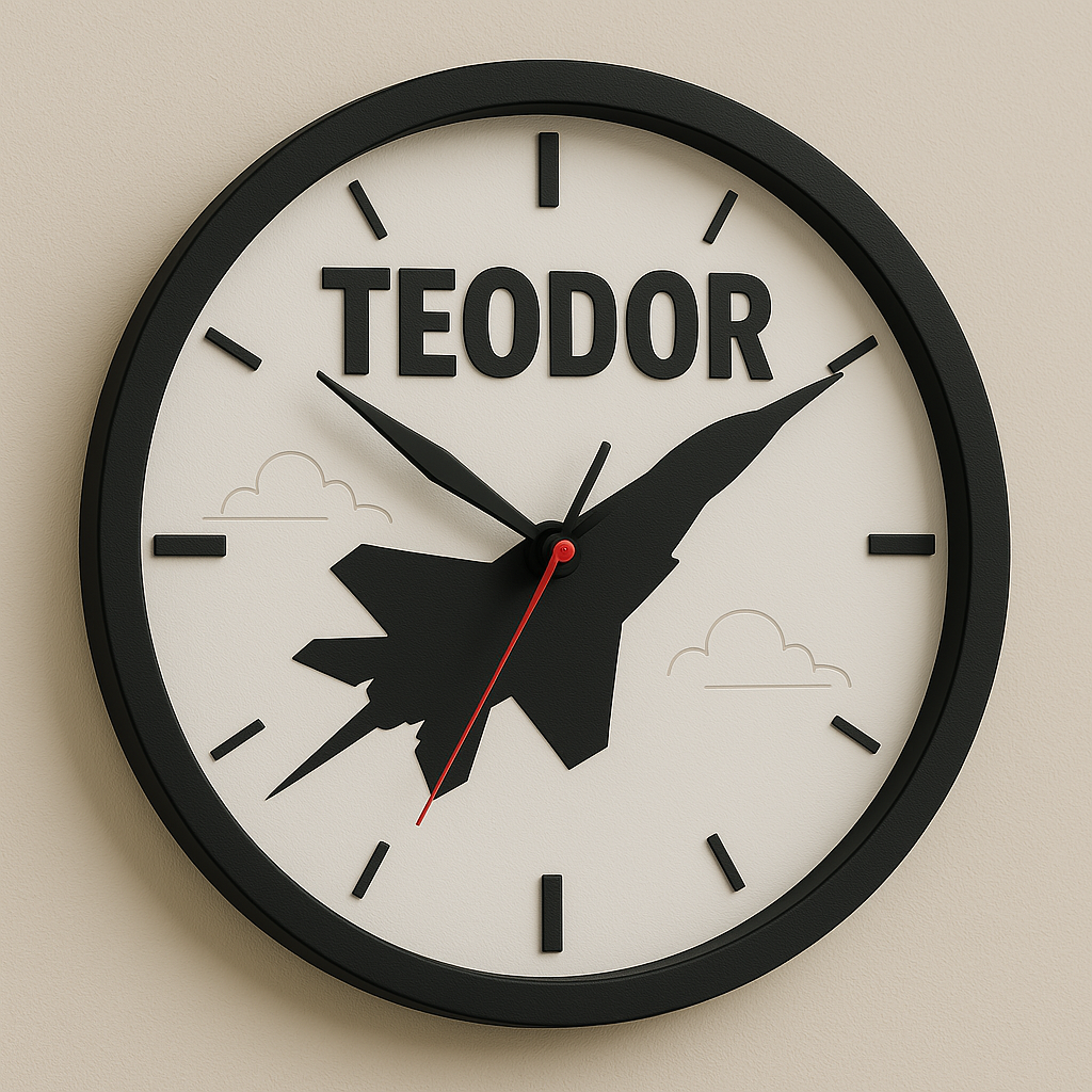 Ceas de perete personalizat cu siluetă de avion supersonic și nume decupat în relief, perfect pentru copii sau adolescenți pasionați de zbor, aviație și aventură. Este un cadou original, creat cu grijă și atenție la detalii, ideal pentru a aduce un strop de inspirație în orice cameră. IMPORTANT: Nu uita să specifici numele dorit în câmpul de personalizare la plasarea comenzii – acesta este obligatoriu pentru realizarea produsului!