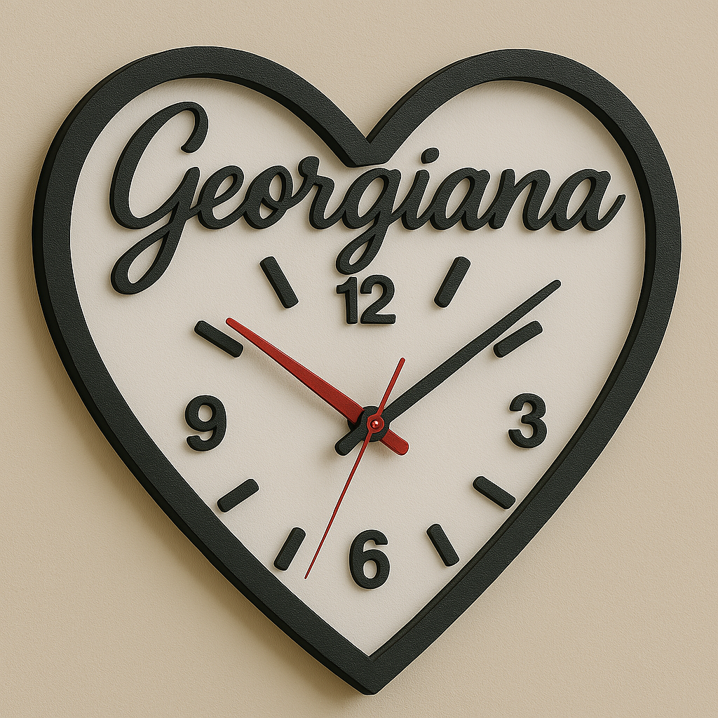 Ceas de perete cu formă de inimă, personalizat cu nume scris într-un font caligrafic elegant. Realizat din MDF de calitate, cu decupaj fin și contrast plăcut alb-negru, este un cadou perfect pentru cineva drag.